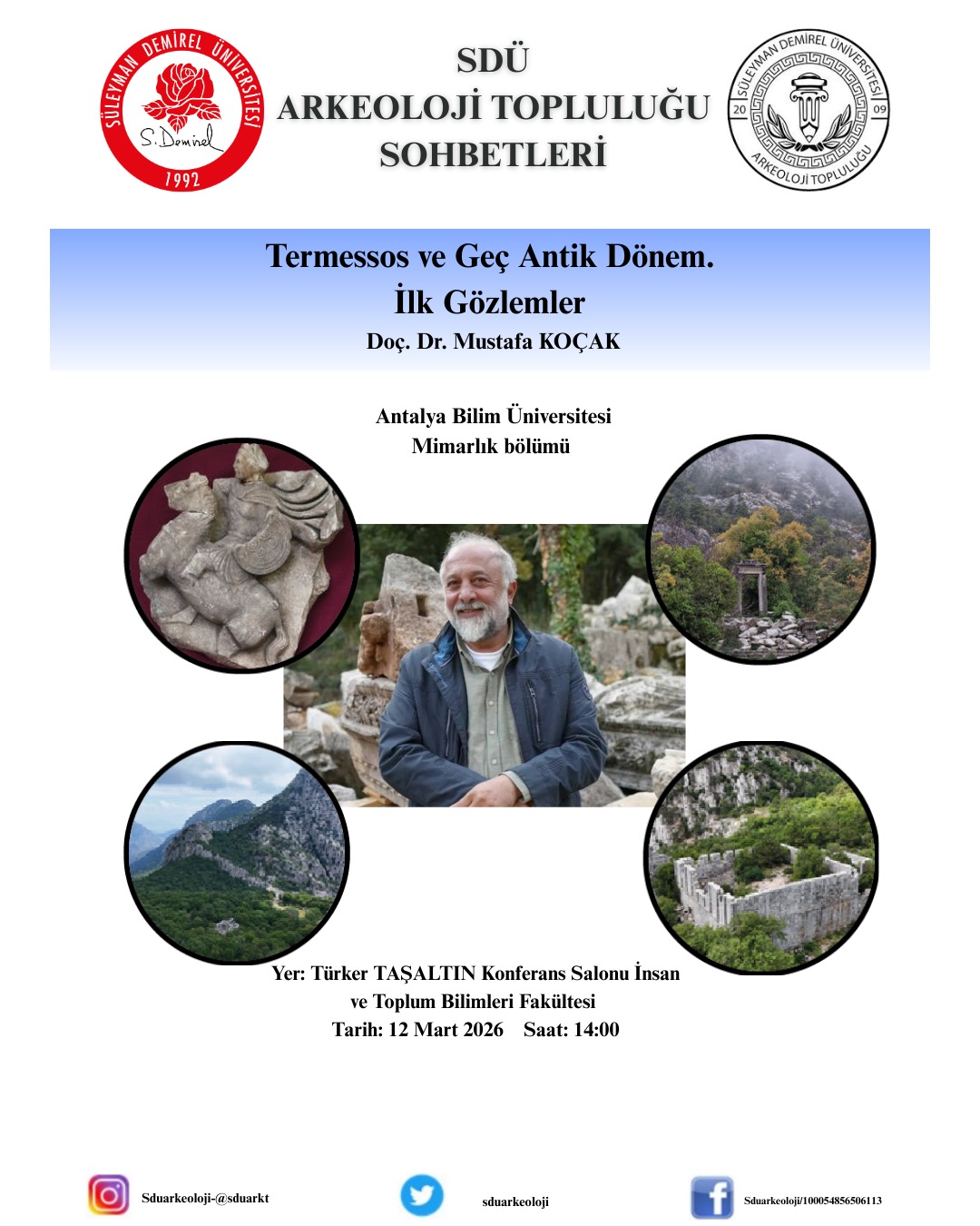 "Termessos ve Geç Antik Dönem. İlk Gözlemler." adlı konferans, Doç. Dr. Mustafa KOÇAK'ın anlatımıyla, Türker Taşaltın Konferans Salonunda 12 Mart 2026 tarihinde saat: 14:00'de gerçekleştirelecektir.