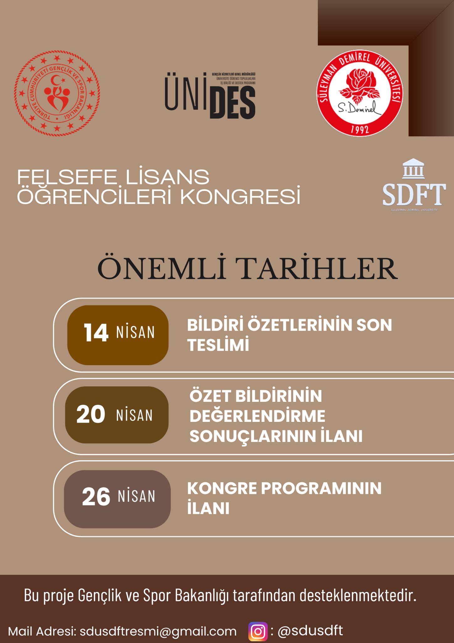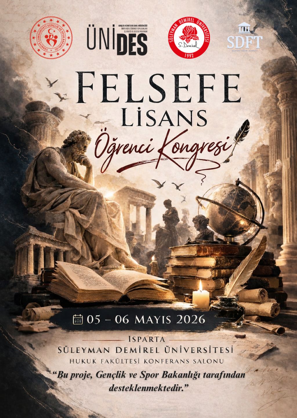 Sosyolojik Düşünce ve Felsefe Topluluğu olarak ÜNİDES 6. Dönem kapsamında Gençlik ve Spor Bakanlığı tarafından desteklenen, “Felsefe Lisans Öğrenci Kongresi” İsimli projemizle destek almaya hak kazanmış bulunmaktayız. Projemiz 05-06 Mayıs 2026 tarihleri arasında Isparta’da gerçekleştirilecektir. Ayrıntılı bilgi için tıklayınız.