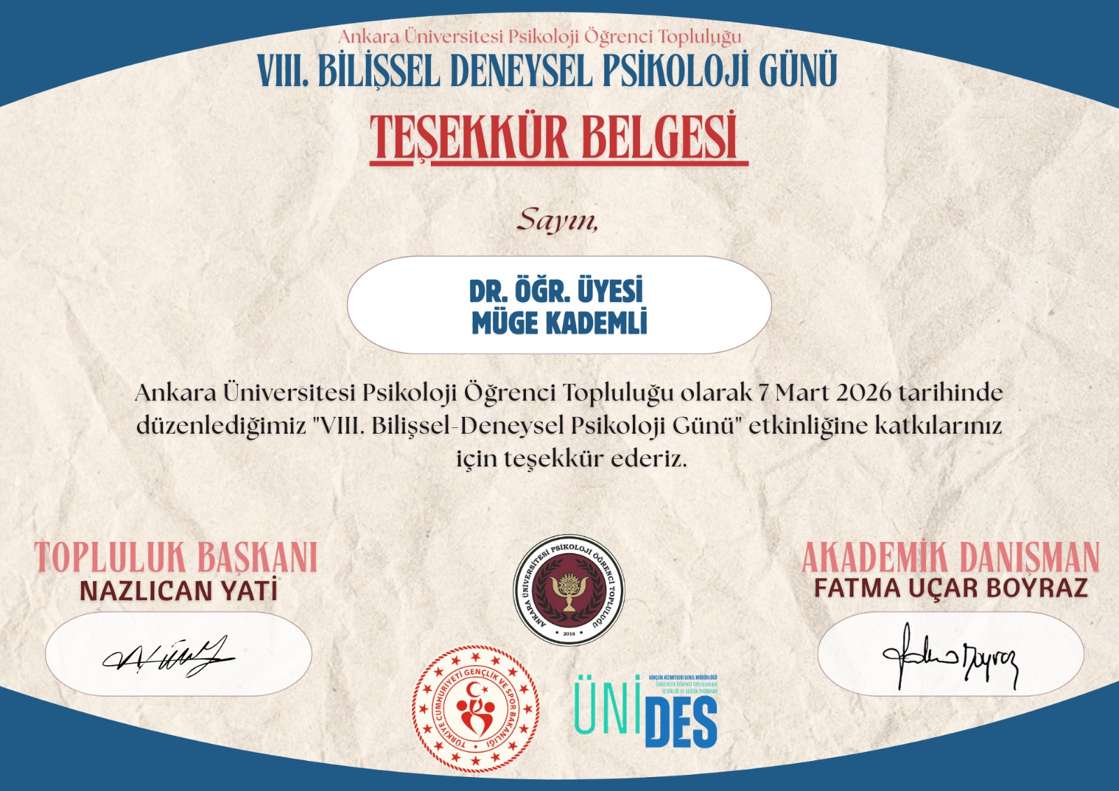 Dr. Öğr. Üyesi Müge KADEMLİ 07.03.2026 tarihinde Ankara Üniversitesi Psikoloji Öğrenci Topluluğunun Gençlik Spor Bakanlığı tarafından desteklenen 8. Bilişsel Deneysel Psikoloji Günleri isimli etkinliğinde "Laboratuvar Deneylerinde Hayvan Kullanımına İlişkin Etik İkilemler" isimli bir workshop gerçekleştirmiştir (Bağlantı)
