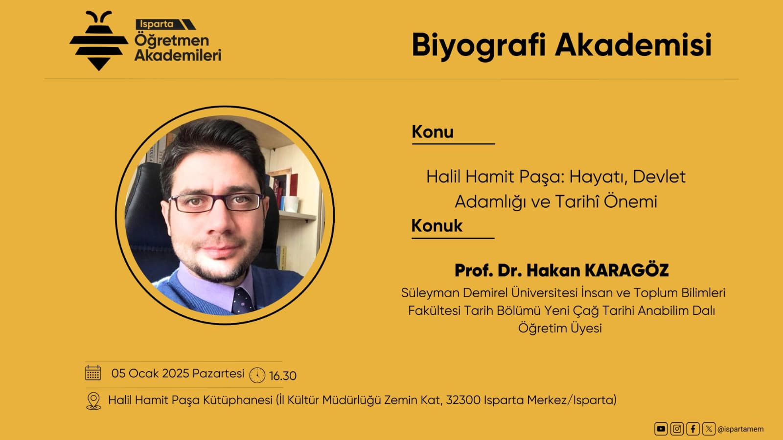 Isparta İl Milli Eğitim Müdürlüğü’nün tertip ettiği Isparta Öğretmen Akademileri etkinliği kapsamında Tarih Bölümü Başkanı Prof. Dr. Hakan Karagöz “Halil Hamit Paşa: Hayatı, Devlet Adamlığı ve Tarihi Önemi” konulu bir konferans vermiştir.