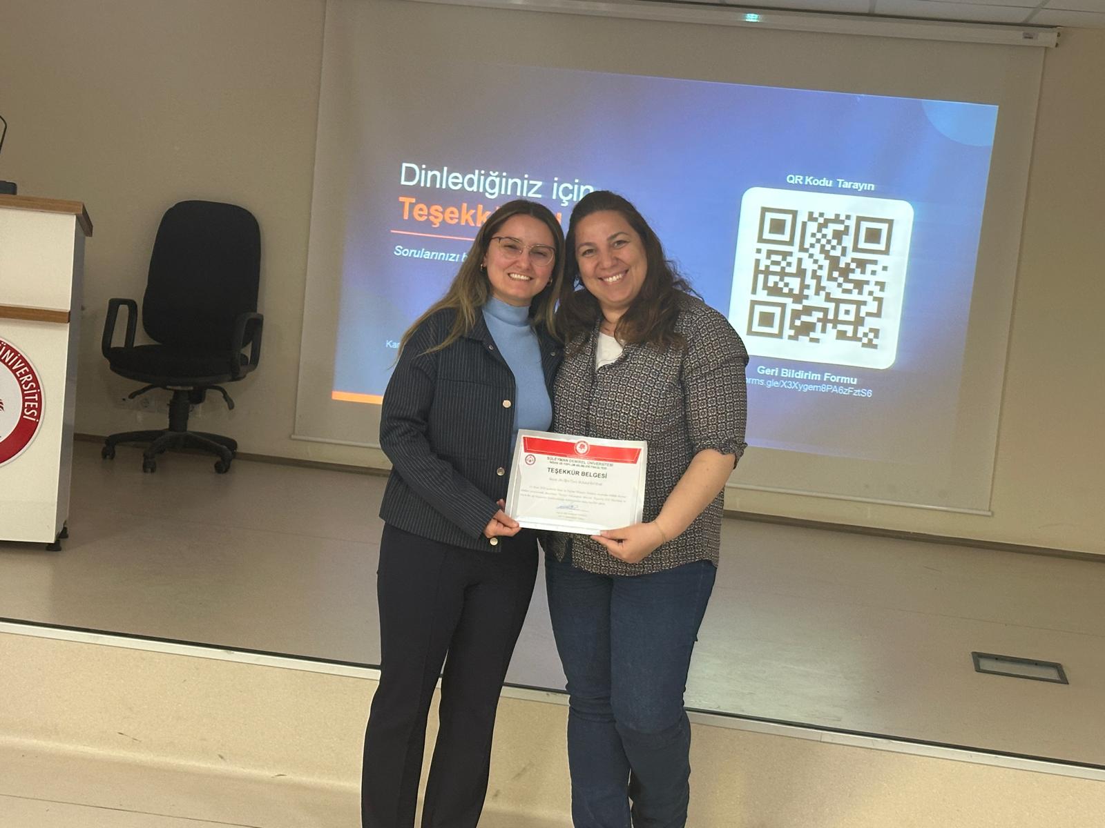 Fakültemiz Türker Taşaltın Konferans Salonu’nda gerçekleştirilen seminerde Dr. Öğr. Üyesi Zuhal BAYDAR; iş bulma sürecini kolaylaştırabilecek temel beceriler, etkili bir özgeçmiş hazırlanırken dikkat edilmesi gereken hususlar ve iş yaşamında güçlü bir profesyonel ağ oluşturmanın önemi üzerine katılımcılarla bilgi ve deneyimlerini paylaştı.Seminerin sonunda, katkılarından dolayı Dr. Öğr. Üyesi Zuhal BAYDAR’a teşekkür belgesi, Fakültemiz Dekan Yardımcısı ve Kalite ve Akreditasyon Komisyonu Başkanı Doç. Dr. Şule ÖZÜN tarafından takdim edildi.